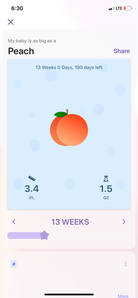 Today I am 13 weeks along! My baby is the size of a peach! Symptoms: morning sickness, headaches, always hungry Cravings: kale chips and buffalo chicken dip!