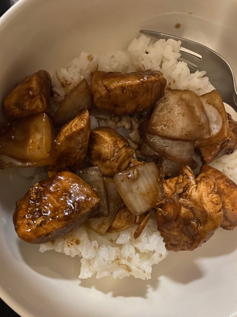 Balsamic chicken! Another easy and delicious dish! In a pan add 2 tablespoons of oil add chicken, salt, pepper, and garlic powder to taste. Once cooked add and onion (slices, diced, whatever your preference is ). Cook it only a bit so it keeps that crunch! Finally mix in about 1/8th of a cup of balsamic to the chicken and onions. Serve over rice and enjoy!